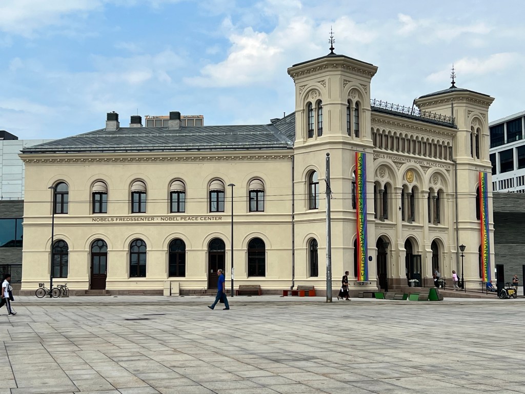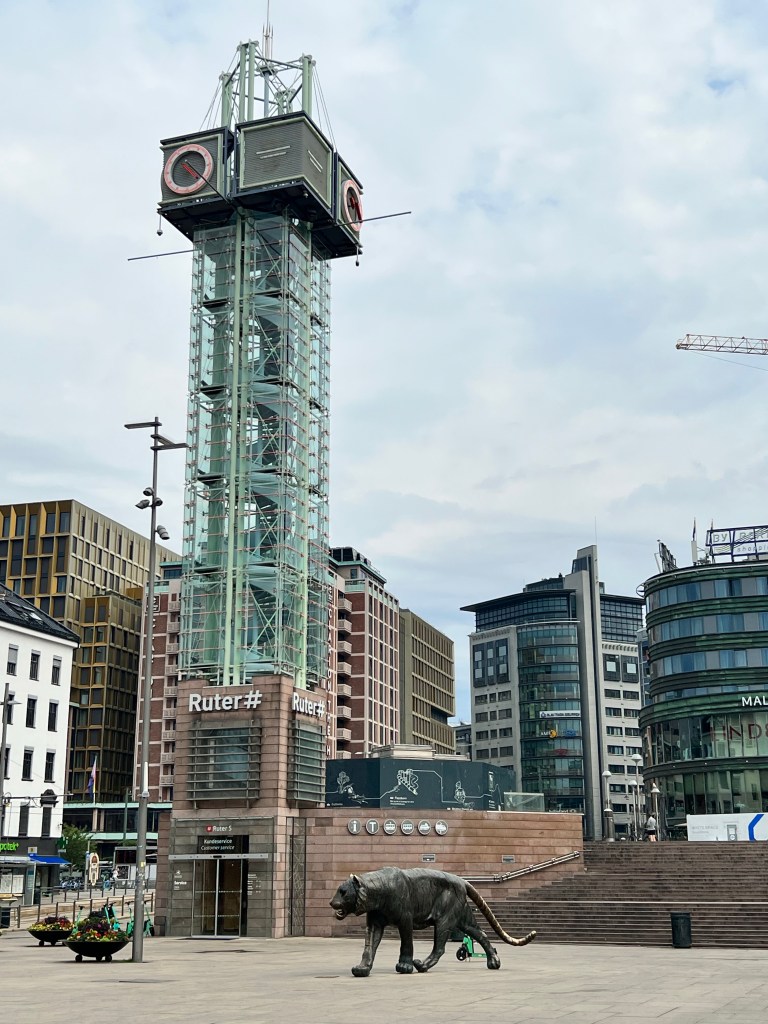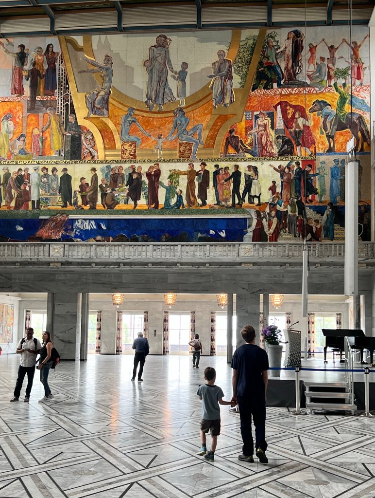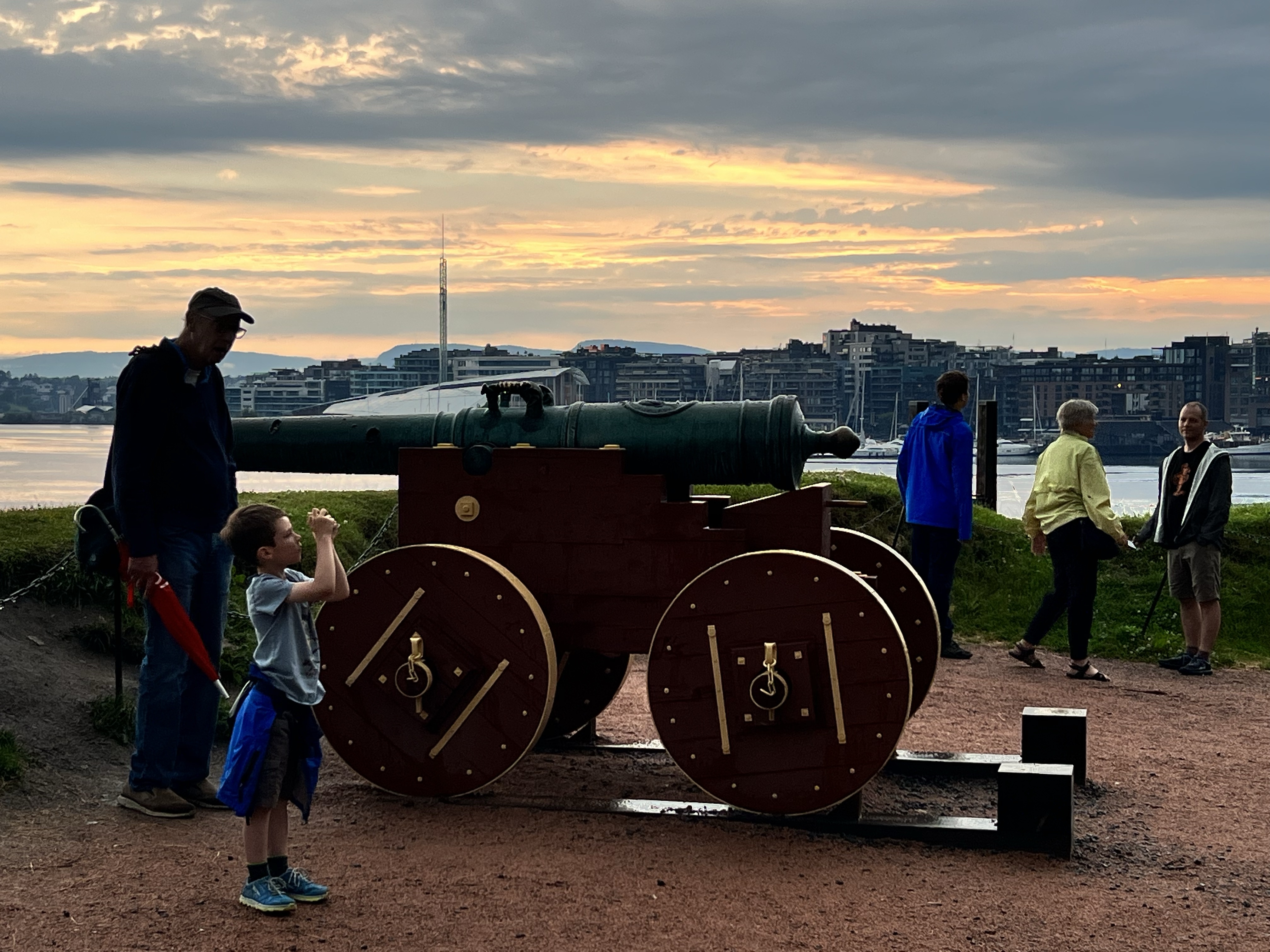 We took a lovely walking tour of Oslo today. Our guide was wonderful. She showed us 2 amazing museums, the Oslo city hall and shared much local knowledge with us. Then, after a quick nap, we set out into the rain to see the Akershus Fortress and find some supper. Of course, this included several stops at small playgrounds!!! And now, here I am…sitting on our balcony at 4:30 am enjoying the city and the Pepsi Max from the hotel fridge.