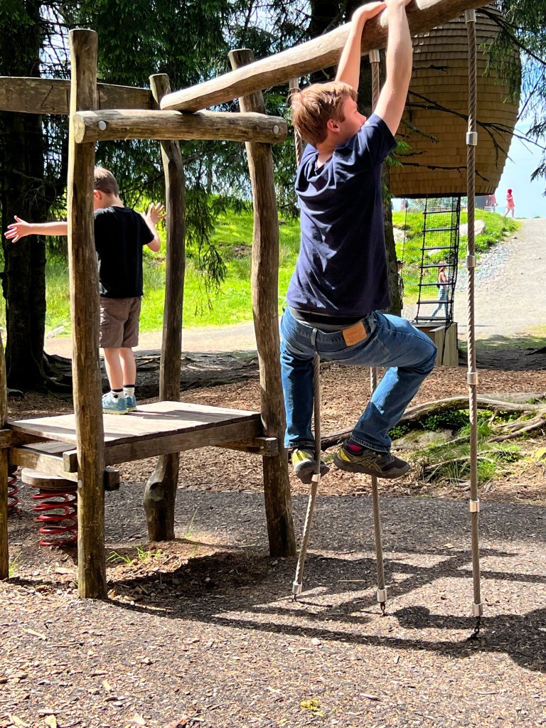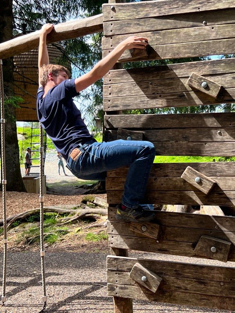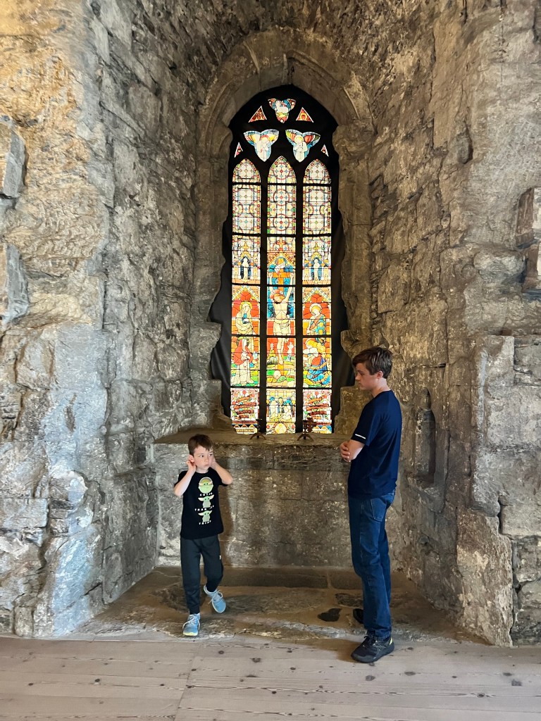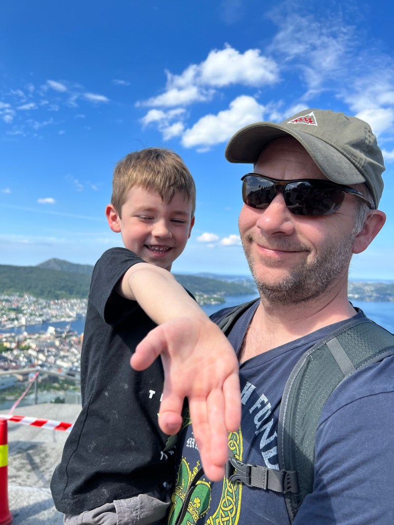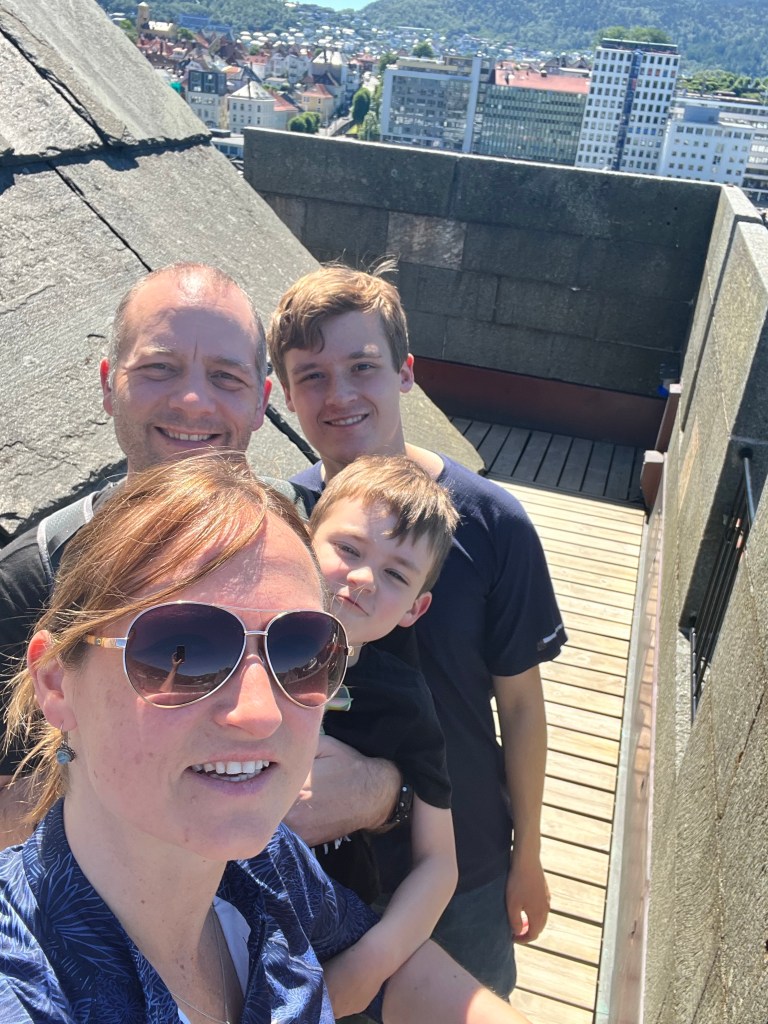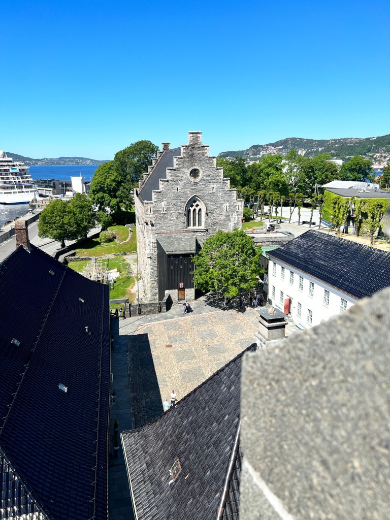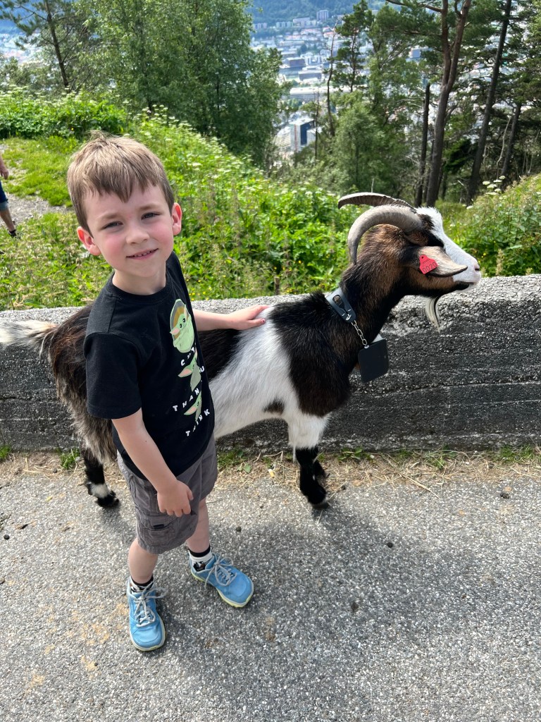 Traveling across Norway can be tiring even with an overnight stop. Our supper on the train after the Viking village consisted of sandwiches from the deli in Gudvangen. Making it to Bergen was worth it, though. Bergen is the second largest city in Norway. After getting out of the train station, we walked past a lovely city park and through a central square. A couple map snafus later, and the tired group found our hotel. Luckily the bar was still open. A glass of wine/beer/orange Fanta along with pretzels & peanuts was just what we needed before heading to bed. One nice thing about Bergen was our lack of schedule. We had 2 days to wander the city. The first thing we did was find the Bergenhus Fortress. We were able to explore the many levels of Rosenkrantz tower and Haakon’s hall that are now a museum. Interesting Fact: An explosion in the harbor in 1944 greatly damaged the fortress & hall. They quickly attached a temporary roof to stabilize the hall & then restored the fortress throughout the 1950s. They were able to finish the restoration by its 700th anniversary in 1961. The next day we headed up the funicular to Fløyen for some dramatic city & harbor views. While Murphy humored us & looked at the views while eating his ice cream & hotdog (ice cream first, of course…), he really was only there for the incredible playgrounds & the goats. We ended our second day by eating a yummy supper & boarding our overnight ferry! More on that next time!!!