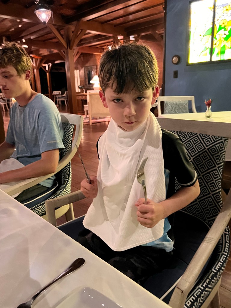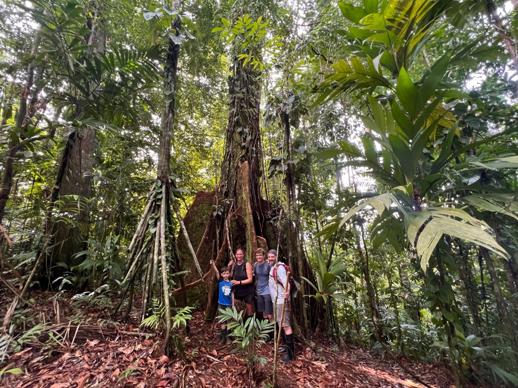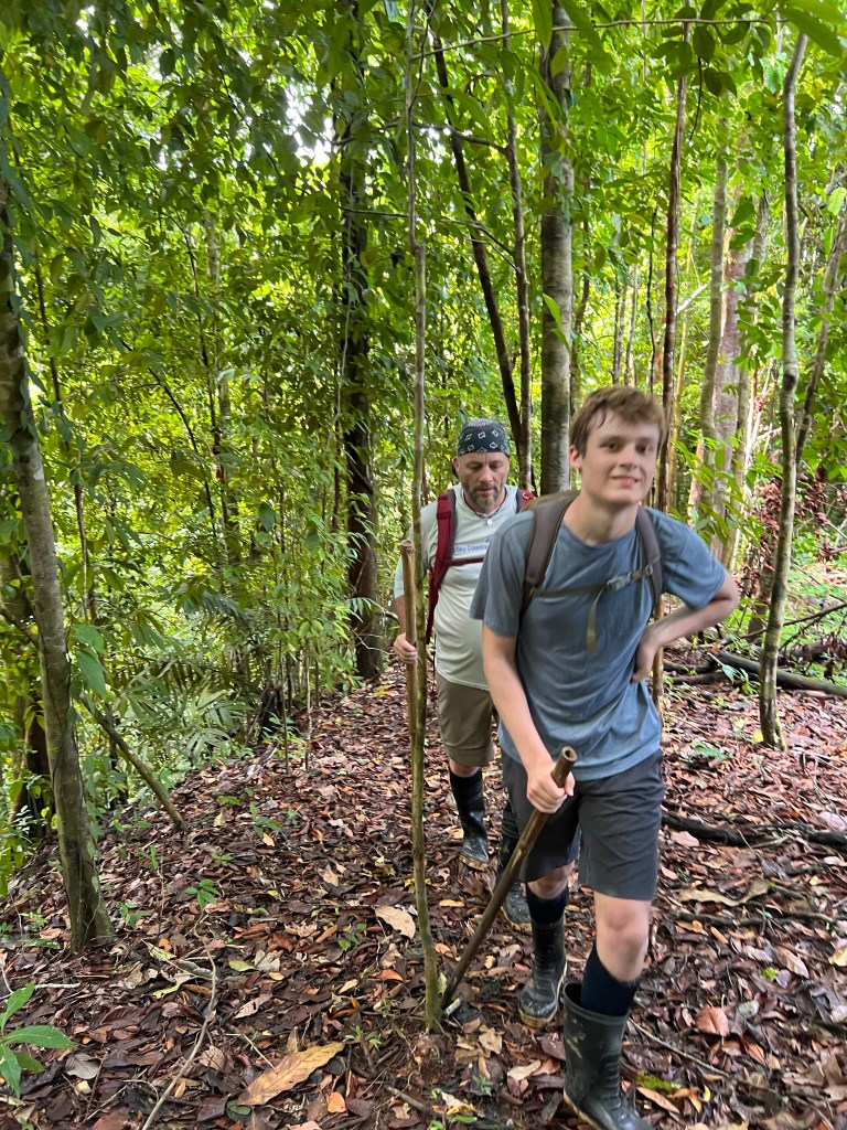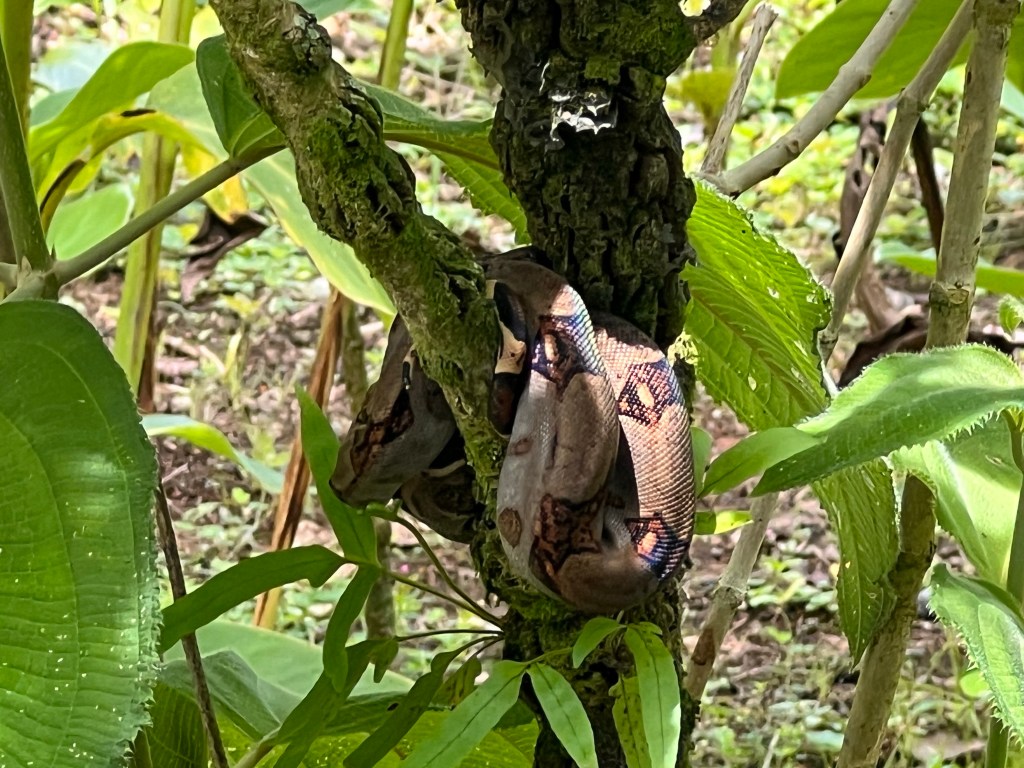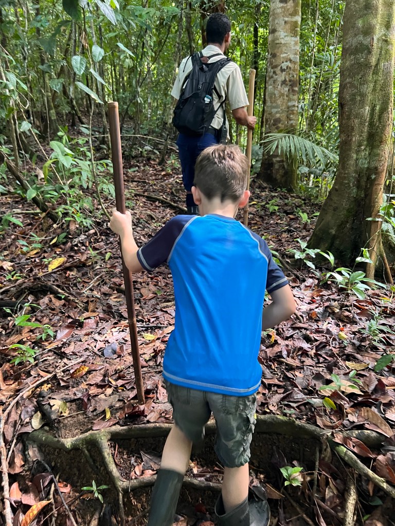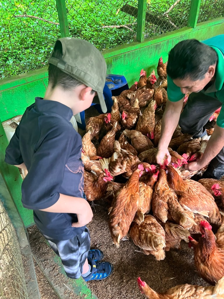 Cativo Lodge, where we are staying, has its own a organic farm to produce many of the herbs and eggs that are part of our meals while we are there. We went on a hike that led us through the forest, past leaf cutter ants and wild boar, all the way to the little farm. When we got to the farm we were greeted by Walter. Walter, who cares for the plants and animals at the farm, greeted us with some amazing coconut, mango, guava, and pineapple. He prepared all of this for us with his machete. When Murphy was two shy to hold a chicken, Walter gave him an egg that he carried all the way back to the kitchen and gave to the chef. The next morning the chef scrambled the egg up for Murphy and he ate it for breakfast. Murphy said it was the best egg he’s ever had.